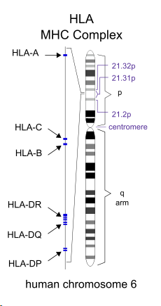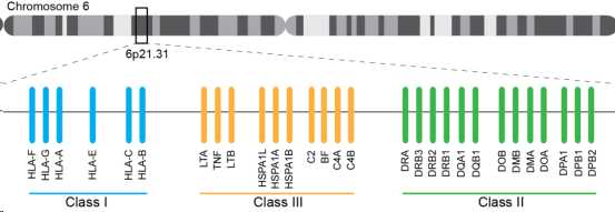 HLA全長約3.6M,含有220多種功能不同的基因,是目前已知的人類染色體中基因密度最高、多態(tài)性最為豐富的區(qū)域,位置示意圖如下: