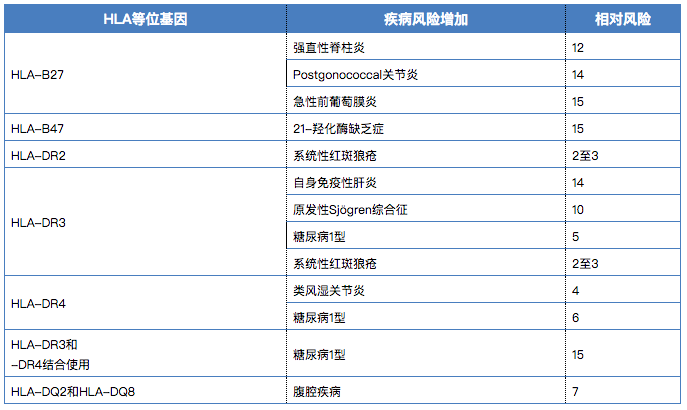 1972年Russel報告銀屑病(牛皮癬)患者攜帶HLA-B13或HLA-B17。此后陸續(xù)發(fā)現(xiàn)大量其它疾病與特定的HLA相關,其中,HLA-B27抗原見于大約90%的強直性脊椎炎病人,由此HLA-B27在臨床檢測中作為強直性脊柱炎的標志物,以至使HLA分型具有了診斷價值,甚至,能較早地證實疾病亞型之間的臨床區(qū)別,例如,尋常銀屑病與HLA相關,而膿皰性銀屑病則不然;青少年性胰島素依賴型糖尿病與HLA-B8、HLA-Bw15和HLA-B18相關,而晚期發(fā)作型糖尿病并無這種相關性。因此,特定類型的HLA便成為某些疾病的遺傳標志。在疾病研究的延伸面,是關于HLA與長壽的關系,目前亦形成一個新的研究熱點。目前研究比較清楚的幾個HLA與自身免疫疾病相關關系如下表: