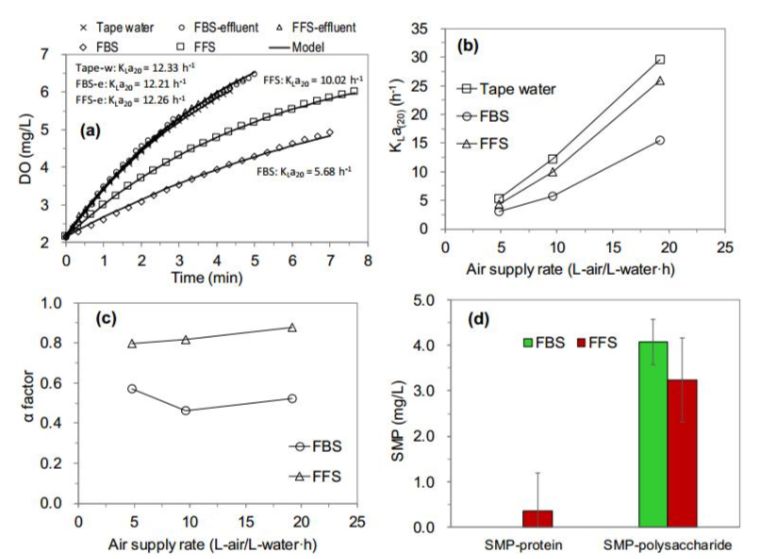 圖2.?(a)FBS及其排出水, FFS及其排出水,?自來水氧轉運試驗中的溶解氧濃度(mg/L);不同曝氣條件下,FBS和FFS的(b)KLa值;(c)α-因子值;(d)FBS和FFS的溶解性微生物產物(SMPs):蛋白和多糖濃度(mg/L)