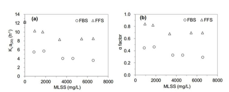 圖3. FBS和FFS的MLSS與(a)KLa(20)和(b)α-因子的相關性