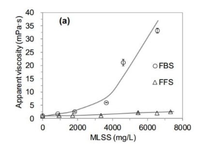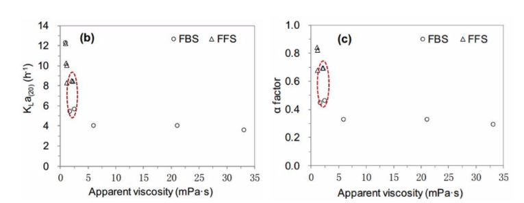 圖4. FBS和FFS的表觀粘度與(a)MLSS、(b)KLa(20)和(c)α-因子的相關性。