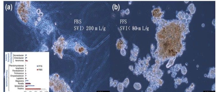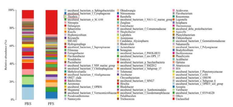 FBS和FFS的菌群結構如圖7所示。FBS和FFS含有大量的共有菌,其中絲硫菌屬(thiothrix)、球衣菌屬(Sphaerotilus)、古字狀菌屬(Runella)、meganema(甲基桿菌科分類下的屬)、纖毛菌屬(Leptothrix)、金黃桿菌屬(chryseobacterium)、毛球菌屬(Trichococcus)、黃桿菌屬(Trichococcus)、isosphaera(浮霉菌科分類下的屬)和浮霉菌科(planctomycetaceae)是FBS和FFS豐度排名前十的菌;?FBS和FFS的優勢菌存在差異,未分離培養(uncultured)的噬纖維菌(cytophagaceae)和鞘脂桿菌(sphingobacteriales)分別在FBS和FFS中豐度最高;FFS和FBS的所有菌在各自反應器的排出水中均被檢測到。從圖8來看,絲硫菌屬(thiothrix)在FFB中的相對豐度超過8.5%,而在FFS中數量極少,絲硫菌屬(thiothrix)的長菌絲(0.5-1.5 μm)會連接污泥絮狀物,導致污泥降解能力降低,污水的表面粘度增加;盡管球衣菌屬(Sphaerotilus)和古字狀菌屬(Runella)在FFS和FBS中的豐度均較高,但它們的菌絲較短,對污泥沉降、表觀粘度和氧轉運的負面影響較小;其他絲狀細菌的豐度較低,影響程度較小。因此推測,絲硫菌屬(thiothrix)就是影響FBS氧轉運的最大“元兇”。從種水平來看,絲硫菌屬(thiothrix)分類下的eikelboomii是FBS的優勢菌,至此,“真兇”也基本確定。