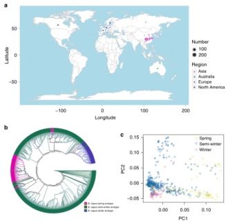 作為較早的異源多倍體作物之一,B.napus通過B. rapa和B.oleracea雜交形成,估計甘藍型油菜(B.napus)的形成時間為~6700和~7500年前及38000-51000年前。文獻中記載,冬季甘藍型油菜首次在歐洲種植,大約在1700年,春季甘藍型油菜開始種植并在18世紀末傳播到英國,半冬生態型主要在中國種植,在1930 – 1940年間從歐洲引入。然而,并沒有真正已知的野生甘藍型油菜(B.napus)群體,導致雜交形成B.napus的兩個祖先種的√確身份仍然難以捉摸,因為B. rapa和B. oleracea具有形態多樣的亞種,并且通常在整個歐洲種植了幾百年。這些物種之間的天然雜交偶然性地在適當的條件下發生。雖然最近的一項研究表明甘藍型油菜(B.napus)的A亞基因組可能來源于歐洲蕪菁(B. rapa ssp. rapa)的祖先,但是由于僅5份B.napus和27份?B. rapa種質被納入該項分析中,因此需要提供更多支持該結論的證據。先前基于細胞核和葉綠體標記的研究也表明,甘藍型油菜可能是從蘿卜和西蘭花之間的種間雜交發育而來,或是由幾個獨立的雜交事件形成的。為了進一步了解甘藍型油菜的進化,有必要揭示野生種或馴化種的供體是否是親本祖先,其中B. rapa和B. oleracea亞種參與甘藍型油菜的形成。