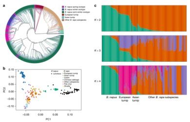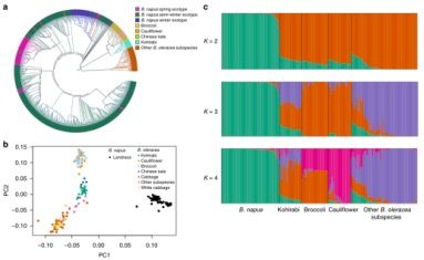 全基因組重測序這一技術手段已被用于鑒定有助于作物馴化和改良的基因,例如水稻(Oryza sativa),番茄(Solanum lycopersicum)和大豆(Glycine max)。三個蕓薹屬祖先種和異源多倍體種B. napus和B. juncea的基因組已經釋放。199份B. rapa和119份B. oleracea種質的重測序將有助于研究B. napus中每個亞基因組中的受選擇作用,同時將澄清該物質的祖先種。