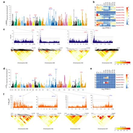 為了鑒定與11個農藝性狀相關的候選基因,研究人員利用了多位點隨機混合線性模型mrMLM v1.3進行全基因組關聯分析研究(genome-wide association studies)。為了獲得高質量的SNPs,研究人員對Bna SNP集合進行了估算,保留了670,028個SNP,MAF> 5%,用于后續的GWAS分析。通過19個樣品多態性核苷酸和Sanger測序結果的評估比較,表明98.74%的推算基因型是正確的,20份種質的兩個生物學重復推算的與真實的基因型的平均系數(r2)為0.956,最小值和最大值范圍從0.928到0.967,進一步證實推算的基因型的z確性。最終共計鑒定了與10個目標性狀顯著相關的60個位點,其中5個與種子產量相關,3個與長角果長度相關,4個與油脂含量相關,48個與種子質量相關(圖4c),此外,3個位點在閾值范圍內顯示與開花時間相關,與種子質量性狀顯著相關的SNPs解釋了14.30%?到35.47%的表型變異,高于種子產量(16.81%)和含油量(20.64%),此外,本研究中還檢測到與先前的GWAS研究中與種子質量相關的大部分基因座。由于與油含量和產量的相關性狀是復雜的并容易受到環境變化影響,研究人員將本研究中重要的基因座位與前期研究的QTLs位點進行了整合。因此,在受選擇區與QTLs定位區域內,基于功能注釋和轉錄組分析控制不同性狀的候選基因被鑒定,如下分析。
