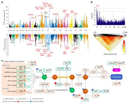 研究人員在FLOR-ID(FLOweRing Interactive Database)中檢索到了306個基因與擬南芥開花時間相關,在甘藍型油菜中鑒定了1,225個直系同源基因。在兩組比對中,24?個開花時間相關基因同時坐落在受選擇區域中(圖5a,c),其中22個分布在C亞基因組上,主要通過春化和光周期途徑調節開花時間。特別地,FLC基因座及其染色質介導的調節原件將是調控甘藍型油菜開花時間的*有希望的靶標。