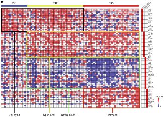 該研究共鑒定到11340個不同的基因產(chǎn)物,覆蓋了腫瘤細胞及腫瘤微環(huán)境所有可能表達的蛋白。研究人員對胃癌與癌旁組織全蛋白表達譜進行聚類分析,將彌漫型胃癌分為三個分子亞型(PX1~3),且這三個亞型與生存預后和化療敏感性密切相關。這是世界上實現(xiàn)在蛋白層面上對腫瘤進行分子分型,且分的的亞型與預后和化療有顯著性關聯(lián)。其中PX1型(細胞周期型),總生存時間最長;PX2型 (上皮-間充質(zhì)轉化型),生存預后介于PX1和PX3之間;PX3 (免疫通路富集型)患者腫瘤組織高表達蛋白富集在免疫響應相關通路和EMT相關蛋白上,總生存時間最短,并且該組患者對化療不敏感。