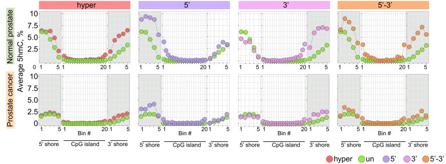 文章結(jié)果發(fā)現(xiàn)在5’或3’不對稱甲基化的CpG島邊界,正常細(xì)胞中具有高甲基化,但廣泛甲基化的或雙向甲基化堆積的CpG島在island shores具有高甲基化水平。正常組織中5hmC對DNA去甲基化及未甲基化CpG島的保護具有重要作用。此外癌組織中5hmC大范圍的減少可能會參與CpG島的超甲基化。文章采用3對前列腺癌樣本進行5hmC與5mC檢測,正常組織中表現(xiàn)出增強的CpG島shores 5hmC水平,且基因CpG島DNA甲基化堆積伴隨shores處5hmC的降低。