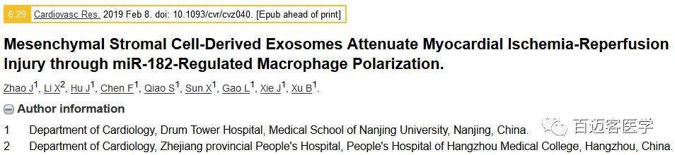 該研究由南京大學(xué)醫(yī)學(xué)院附屬鼓樓醫(yī)院的學(xué)者完成,題目:間充質(zhì)基質(zhì)細(xì)胞來源的外泌體通過miR-182調(diào)節(jié)巨噬細(xì)胞極化減弱心肌缺血再灌注損傷。