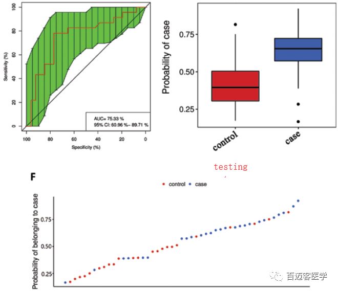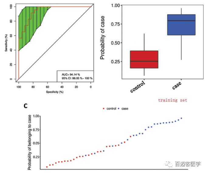 使用training set鑒定到一組11個miRNA,其AUC(Area Under Curve)為0.94 (95% CI, 0.88–1.0),敏感性0.783,特異性0.957。