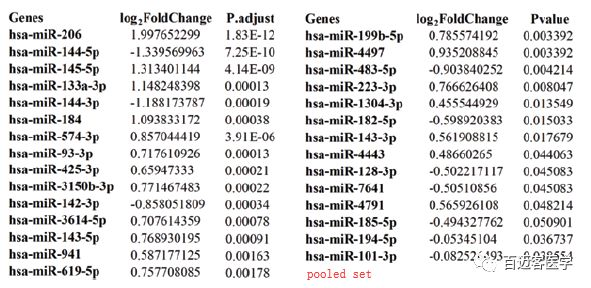 3)pooled set:綜合上述2個set,共計6個miRNA符合上述條件:6 miRNAs (hsa-miR-206、hsa-miR-145-5p、hsa-miR-133a-3p、hsa-miR-144-5p、hsa-miR-144-3p和hsa-miR-184)。