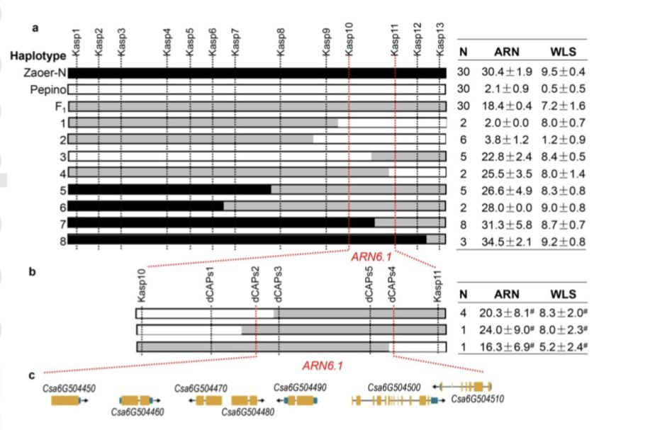 本研究利用SLAF-BSA技術(shù),將黃瓜耐澇基因定位在301kb區(qū)間內(nèi)(初定位群體為949株,選擇50+50的混池),針對定位區(qū)間的SLAF標(biāo)簽的SNP信息設(shè)計(jì)KASP標(biāo)記和dCAPS標(biāo)記,并對6691個(gè)F2子代和6個(gè)F2:3家系進(jìn)行分型,結(jié)合重組個(gè)體基因分型和表型數(shù)據(jù),將ARN6.1定位在36.1kb的范圍內(nèi),后期結(jié)合轉(zhuǎn)錄組,找出候選基因CsARN6.1。