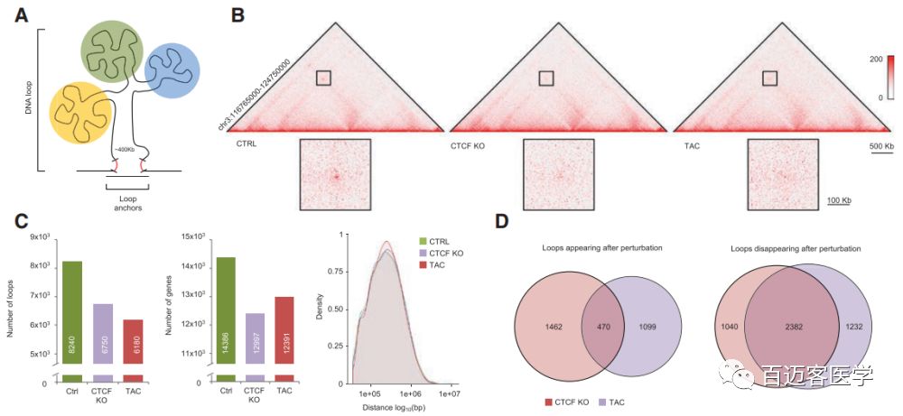 CTRL、CTCF-KO、TAC小鼠的TAD結(jié)構(gòu)分析顯示,三組的TAD數(shù)量分別為3686、3746和3705個,雖然整個基因組的TAD邊界數(shù)量變化小于2%,但是邊界強度發(fā)生了不同的變化。此外,CTCF-KO、TAC小鼠的染色體均有新的TAD邊界,包括發(fā)生邊界的轉(zhuǎn)移和新邊界的形成。