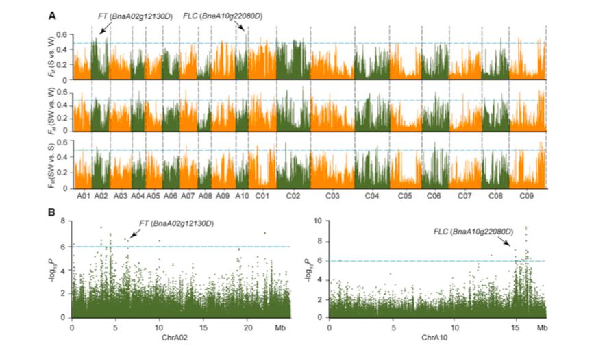 該研究對991份油菜天然種質資源進行了遺傳多樣性的測序和鑒定。通過對兩個不同的參考基因組,即“Darmor-bzh”和“Tapidor”基因組的定位讀數產生的兩組SNPs的群體遺傳學分析,得出了一致的結論。遺傳多樣性和連鎖不平衡參數表明甘藍型油菜兩個亞基因組的進化是不對稱的。選擇性掃描分析揭示了與調控植物發育和應激反應的各個方面相關的基因的遺傳變化。并對影響開花時間的SNPs進行了探索。