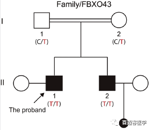 由于父母為近親結婚,首先考慮常染色體隱性遺傳模式,確定了2個具有功能喪失突變或潛在有害的錯義突變位點。結合基因功能分析等條件過濾后,鎖定了一個新的非同義突變FBXO43(C1991T,p.G664D)。通過Sanger測序,證實了2個兄弟存在FBXO43中的C1991T純合突變。先證者的父母攜帶雜合突變。