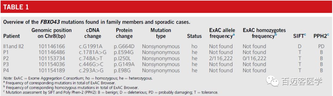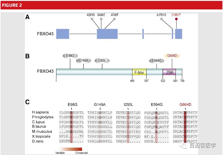 (注:該圖中除C1991T(G664D)外,其他突變為在散發樣本中發現的FBXO43基因突變)