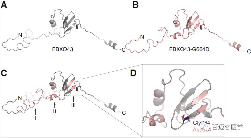 FBXO43(c.1991C>T)非同義突變導致FBXO43蛋白664殘基從非極性氨基酸(Gly甘氨酸)轉變為帶負電荷的氨基酸(Asp天冬氨酸)(G664D)。蛋白質二級結構通過in silico結構模型預測,與野生型相比,具有2個明顯縮短的β-折疊(殘基654-668)、額外產生的α-螺旋(殘基610-613)和明顯變化的loop(殘基583-618)。