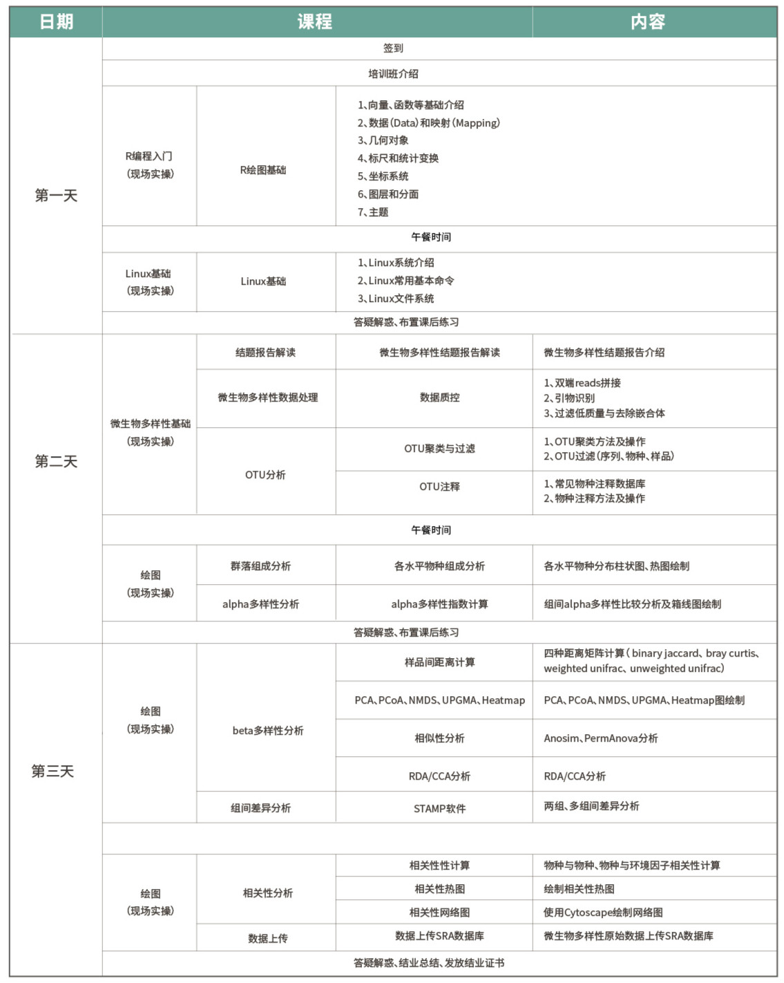 本次課程通過采用理論和實踐緊密結合的教學形式,以理論基礎至數據挖掘層層遞進的方式,讓大家在短時間內對微生物研究中涉及的知識和方法得到迅速提升。同時,在3天課程中,我們現場會有講師與助教與大家面對面的咨詢探討在研究思路、以及分析方面等遇到的問題,從而在多元思維中幫助大家開拓思路,挖掘微生物更多的價值。