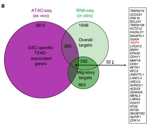 GSC中TEAD1可接近區域peak(ATAC-seq)和基因表達水平(RNA-seq)的一致性分析,結合GBM中TEAD1與基因共表達(TCGA中的GBM RNA-seq數據)分析,發現TEAD1的靶基因包括EGFR、AQP4、CDH4、TNC等多個候選靶基因。