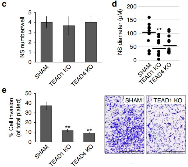 作者通過ATAC-seq繪制了膠質母細胞瘤干細胞(GSC)和神經干細胞(NSPC)的全基因組染色質開放區域圖譜,并結合轉錄組測序數據發現了在腫瘤細胞遷移中起關鍵作用的轉錄因子TEAD1,并通過細胞和異種移植模型水平上的TEAD1的敲除與過表達的體內外功能驗證實驗,驗證了TEAD1促進遷移的功能性作用。
