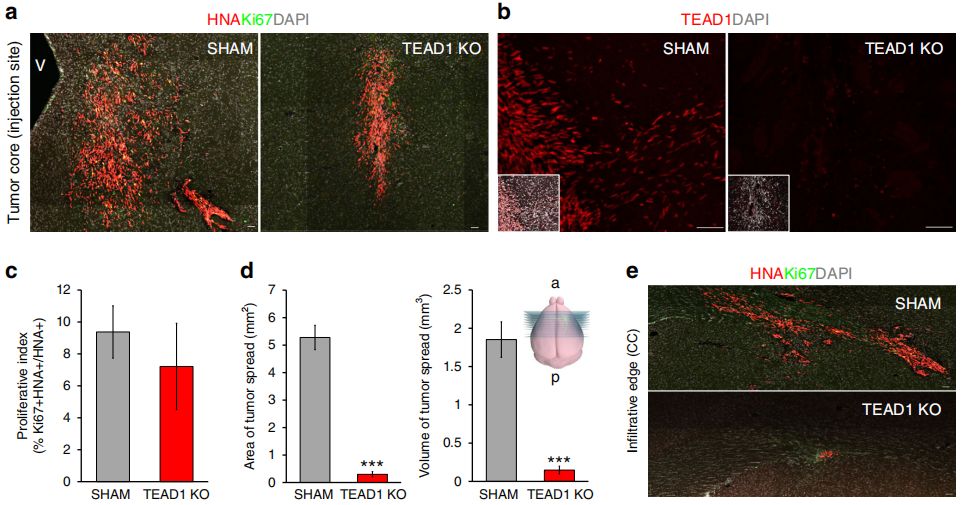 此外,作者分析了所有TEAD家族成員(1-4)在TCGA數據庫RNA-seq數據中的表達水平,發現TEAD1是150個GBM樣本中表達最高的TEAD家族成員,且在蛋白水平上,TEAD1在PDX膠質瘤中表達。因此,TEAD1是GBM腫瘤中表達最高、表達最廣泛的TEAD家族成員。