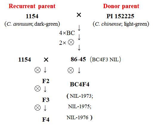1. 群體構建:1154(深綠;C. annuum),PI 152225(淡綠;C. chinense);86-45(BC4F3 NIL,含來自PI152225的pc1區段)(圖 1.及圖 2.)