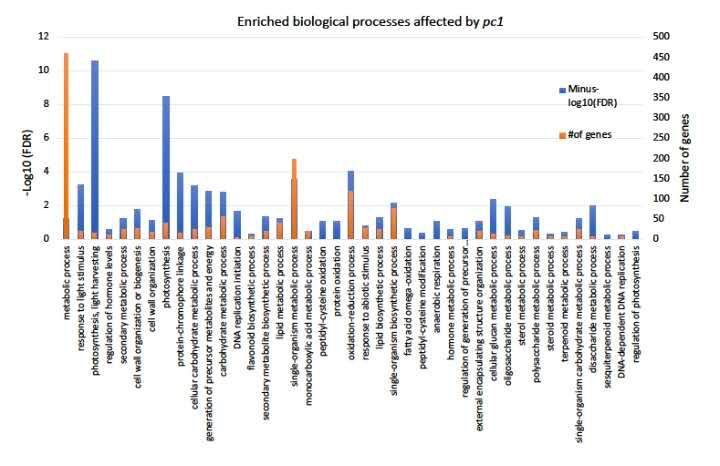 為研究pc1參與影響的細胞學過程,本研究對混池間983個差異表達基因進行GO富集分析并根據生物過程進行分類(圖5)。最顯著的GO term過程與光合作用及氧化還原有關,這兩個過程包含184個DEGs,被分成17個亞類,其中最大的一類是氧化還原過程。這一類基因與葉綠素合成下調有關,例如,POR,CAO與HEMA1,還與葉綠素降解基因上調有關,例如,CA00g73130,暗示葉綠素合成與降解受這個QTL調控。另一類重要基因,包含Chlorophyll a/b-結合蛋白的多個成員基因(CA01g17090,CA02g12050,CA02g12060,CA02g12070等),在淡綠混池中下調表達,它們參與光合、蛋白發色團及光刺激響應等過程。另外,若干與碳固定有關的Rbc家族基因在淡綠混池中也呈現下調表達。