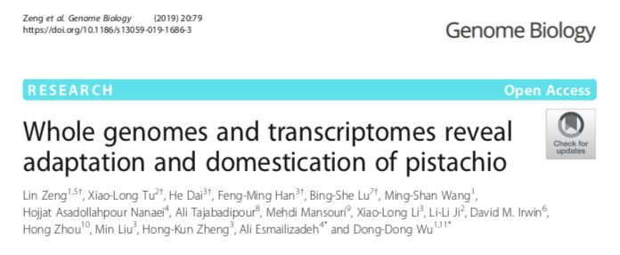 2019年04月18日,Genome Biology在線發(fā)表了中國科學院昆明動物研究所與北京百邁客生物科技有限公司共同合作文章“Whole genomes and transcriptomes reveal adaptation and domestication of pistachio” 中國科學院昆明動物研究所研究員吳東東為本文通訊作者,中國科學院昆明動物研究所曾琳,北京百邁客公司大項目負責人韓鳳鳴,戴鶴為共同第一作者。本文繪制了開心果的基因組草圖,并對其進行了大規(guī)模的基因組重測序并進行了比較基因組分析,表明,開心果的應激適應可能與細胞色素P450和幾丁質(zhì)酶基因家族的擴增有關。尤其重要的是,比較轉(zhuǎn)錄組學分析表明茉莉酸(JA)生物合成途徑在開心果耐鹽性中起著重要作用。此外,研究人員對93個栽培種和14個野生種(P. vera)基因組及35個親緣關系密切的野生黃連木屬基因組進行了重測序,以提供對種群結(jié)構(gòu)、遺傳多樣性和馴化的見解與思路。
