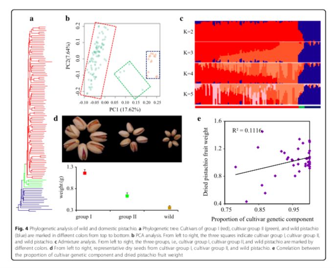 基于重測序數(shù)據(jù),研究人員推測了這些物種的有效群體大小的變化,并發(fā)現(xiàn)在 Pleistocene期間發(fā)生了瓶頸事件,且在 ~200 kyr前,有效群體大小增加。系統(tǒng)發(fā)育樹顯示馴化和野生開心果之間的分離(圖4a)。利用δaδi推算野生和馴化開心果的分化時間在 ~8000年前,這與早在公元前6750年就表明開心果種子是一種常見的食物這一考古記錄相似。為了深入了解開心果種質(zhì)之間的遺傳關系,研究人員進行了兩項經(jīng)典分析:群體結(jié)構(gòu)和主成分分析(圖4b,c)。這些分析清晰的顯示栽培種質(zhì)分為兩個群。栽培種Group I的LD最高,栽培種Group II和野生開心果的LD衰減值相近。Group II包括 Qazvini,Italiaei和Badami