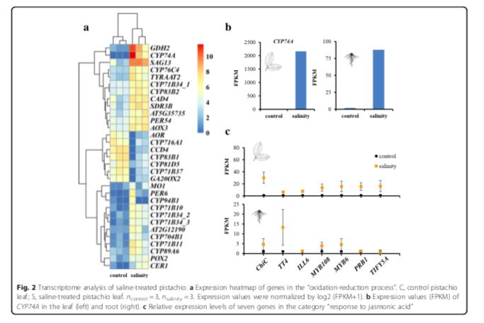 進一步研究開心果的耐鹽性潛在遺傳機制,研究者進行了鹽度實驗。開心果砧木(P.vera?L.cv.Ohadi)的葉和根在正常條件和鹽度條件下進行RNA測序。使用Tophat-Cufflinks-Cuffdiff?pipeline,在鹽水條件下處理的植物與對照之間表現(xiàn)出差異表達,鑒定214和461蛋白質(zhì)編碼基因分別在葉和根組織中(ncontrol = 3, nsalinity = 3, corrected P < 0.05,)。基因富集分析發(fā)現(xiàn)許多差異表達基因(31個基因)參與到“氧化還原進程”中(圖2a,b)。像比較基因組分析一樣,該類別中的15個基因是細胞色素P450基因,特別是CYP74A(即AOS),其編碼細胞色素P450 CYP74基因家族的一個成員,其起到丙二烯氧化物合酶(AOS)的作用。這種酶催化茉莉酸酯合成中的第一步[即茉莉酸(JA)]。AOS中每千堿基外顯子的表達片段(FPKM)值在葉片中從對照中的近0增加到鹽水條件下的2163.75,在根中從對照中的1.87增加到鹽水處理的87.74。研究者還發(fā)現(xiàn)了7個差異表達的基因(ChiC, TT4, ILL6, MYB108, MYB6, PRB1, and TIFY5A)被富集到“茉莉酸反應”中。以前的研究表明,干旱和高鹽度導致水稻葉片和根部JA含量增加。鹽度處理可以增加濕地物種鳶尾(Iris hexagona)中的內(nèi)源JA水平。茉莉酸酯激活植物對生物脅迫(即病原體攻擊)和非生物脅迫(即鹽)的反應。在此,用鹽水處理增加了在葉和根中參與茉莉酸反應的這些基因的表達水平(圖2c)。這些基因的表達增加(例如,AOS作為酶催化茉莉酸酯合成中的第一步)應該增加茉莉酮酸酯的合成,因此,它們很可能被開心果用于應對鹽脅迫。