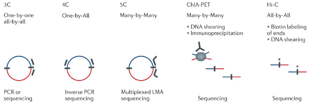 同樣源于3C的用以研究染色體互作的技術還包括4C(“circular?3C”或“3C-on-Chip”)、5C(Chromosome?conformation?capture?carbon?copy)?、ChIA-PET(chromatin?interaction?analysis?by?paired-end?tag?sequencing)?,不同的3C衍生技術的區別在于捕獲的連接片段檢測和定量方式。