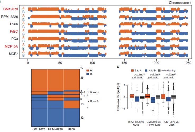 腫瘤細胞系與正常細胞系間A/B?compartment轉換(Pengze Wu1,et al,NC)