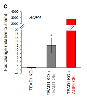 在對照和TEAD1KO細胞中過表達AQP4后,細胞的遷移能力提高了~ 50%,說明AQP4在GBM遷移中發揮了一定作用。且過表達TEAD1后不僅促進細胞的遷移,同時也上調了AQP4的內源性表達。因此,TEAD1和其下游靶基因AQP4的表達在促進原發性GBM細胞的遷移中存在直接的機制聯系。