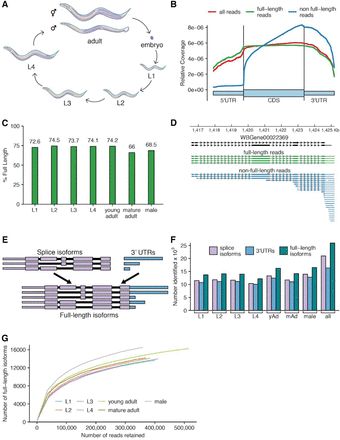 目前絕大多數的轉錄組注釋都是依賴于cDNA高通量測序固有的短讀長測序技術。線蟲的基因組緊湊,注釋良好,細胞譜系穩定,是一種理想的實驗模型生物。然而,在秀麗桿線蟲的轉錄組中,大約有超過一半的轉錄本缺少全長信息的支撐,且依賴于無法跨越轉錄本全長序列的短reads的預測。同時,利用短讀長對polyA和3’UTR進行預測,并不能直接鑒定到剪接轉錄本的起始位點,且在3’UTR鑒定中,依賴于將推測的剪接位點分配給最近的重疊或上游基因。相比之下,納米孔測序沒有理論上的讀取長度上限,能夠在單個分子水平上對轉錄本進行一端到另一端的測序。