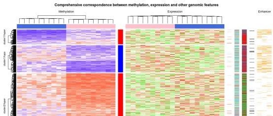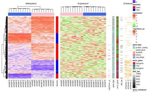 本次,我們將展示一個甲基化與表達譜聯合分析的熱圖。本著先學習再創造的態度,小編做了一下知識的搬運工,本篇所有代碼均引用自:Zuguang Gu, Roland Eils and Matthias Schlesner,?Complex heatmaps reveal patterns and correlations in multidimensional genomic data,?Bioinformatics, 2016。