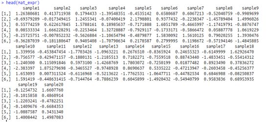 #矩陣,其中行對應于與DMR相關的基因(即與DMR最近的基因,也可以叫做DMR關聯基因),矩陣中的值是每個樣品中每個基因的表達水平(對樣品中的每個基因的表達進行了標準化)。