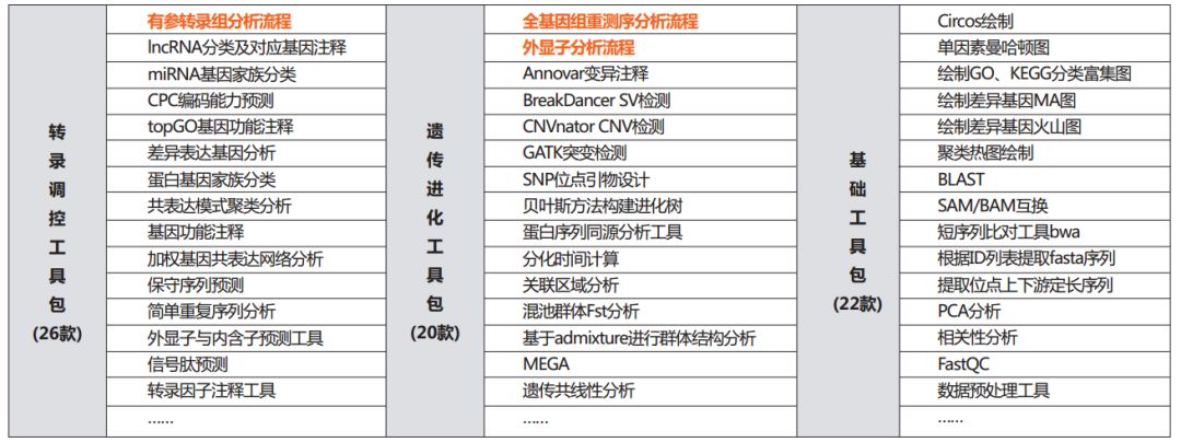 2)軟件:根據用戶需求我們提供了常用生信軟件,并封裝和串聯成常用分析模塊,通過單行命令即可完成很多常規分析內容,如基因表達量計算、突變檢測、基因功能注釋等。