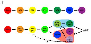 體外分化方法的最終目標(biāo)是為糖尿病患者提供源自多能干細(xì)胞的β細(xì)胞而不是移植胰島。然而,應(yīng)該注意到,目前實(shí)施的醫(yī)療方案涉及全胰島移植,而不是單獨(dú)的β細(xì)胞。事實(shí)上,移植單細(xì)胞類(lèi)型無(wú)法確定是否能夠重新獲得整個(gè)胰島的功能。因此,致力于在體外產(chǎn)生完整的胰島比純粹的β細(xì)胞群更有意義。文章嘗試在體外單細(xì)胞水平產(chǎn)生胰腺內(nèi)分泌細(xì)胞的方法。作者通過(guò)scRNA-seq產(chǎn)生了一個(gè)無(wú)偏的大數(shù)據(jù)集,這使得能夠表征所產(chǎn)生的各種細(xì)胞類(lèi)型,它們的分化時(shí)間以及鑒定影響細(xì)胞命運(yùn)的分子途徑。長(zhǎng)遠(yuǎn)來(lái)看,精細(xì)調(diào)整祖細(xì)胞與內(nèi)分泌命運(yùn)的時(shí)間和平衡的能力可用于控制α和β細(xì)胞之間的比例,并促進(jìn)具有適當(dāng)細(xì)胞組成的胰島的體外形成。
