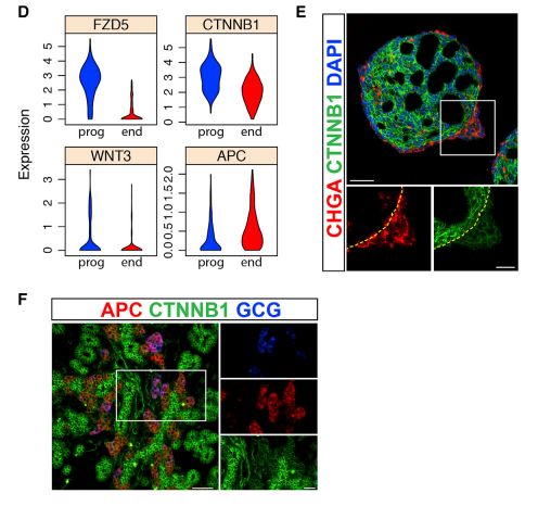 為了研究調(diào)節(jié)未分化祖細(xì)胞與內(nèi)分泌細(xì)胞之間整體平衡的遺傳途徑,基于上皮祖細(xì)胞及內(nèi)分泌細(xì)胞差異表達(dá)的基因,發(fā)現(xiàn)祖細(xì)胞中上調(diào)表達(dá)的轉(zhuǎn)錄本富集于Wnt活化相關(guān)的因子,包括配體WNT3和通路主要傳感器β-catenin,蛋白水平也類(lèi)似(圖BDE);相反,APC作為WNT活性抑制分子,在內(nèi)分泌細(xì)胞中是上調(diào)的(圖D)。在小鼠胚胎中,APC蛋白在內(nèi)分泌半島區(qū)域唯一檢出,在上皮索中β-catenin 水平升高(圖 F)。