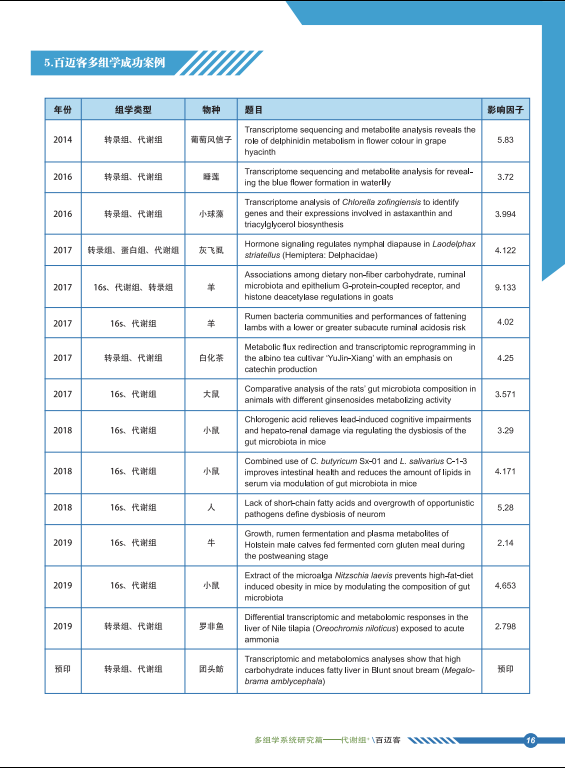 百邁客致力于將好的技術提供給科研者。代謝組服務現已細分服務內容,涉及非靶向代謝組,脂質非靶向代謝組,靶標代謝組,植物高通量靶標,動物高通量靶標,花青素高通量靶標,游離脂肪酸高通量靶標,氨基酸高通量靶標等。目前,百邁客已經協助發表大量多組學聯合文章,涉及到轉錄組 & 代謝組、微生物多樣性 & 代謝組,轉錄組 & 微生物多樣性 & 代謝組。點擊這里下載“百邁客生物代謝組成功案例>>百邁客生物代謝組成功案例