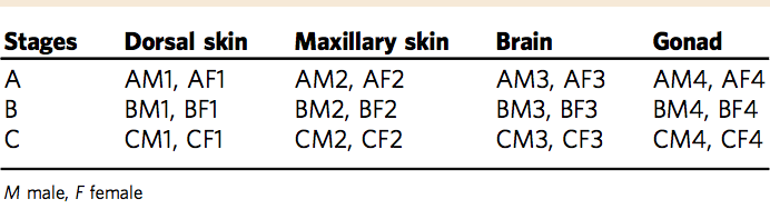 轉(zhuǎn)錄組學分析:亞成年期、繁殖期、繁殖后期雌性及雄性的上頜皮膚、背部皮膚、腦、性腺組織(圖1)