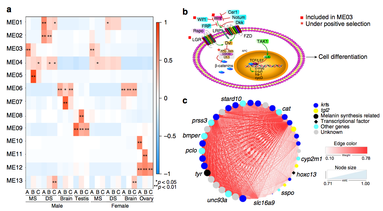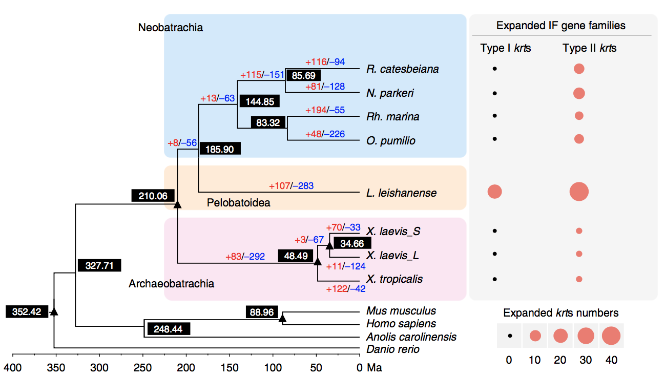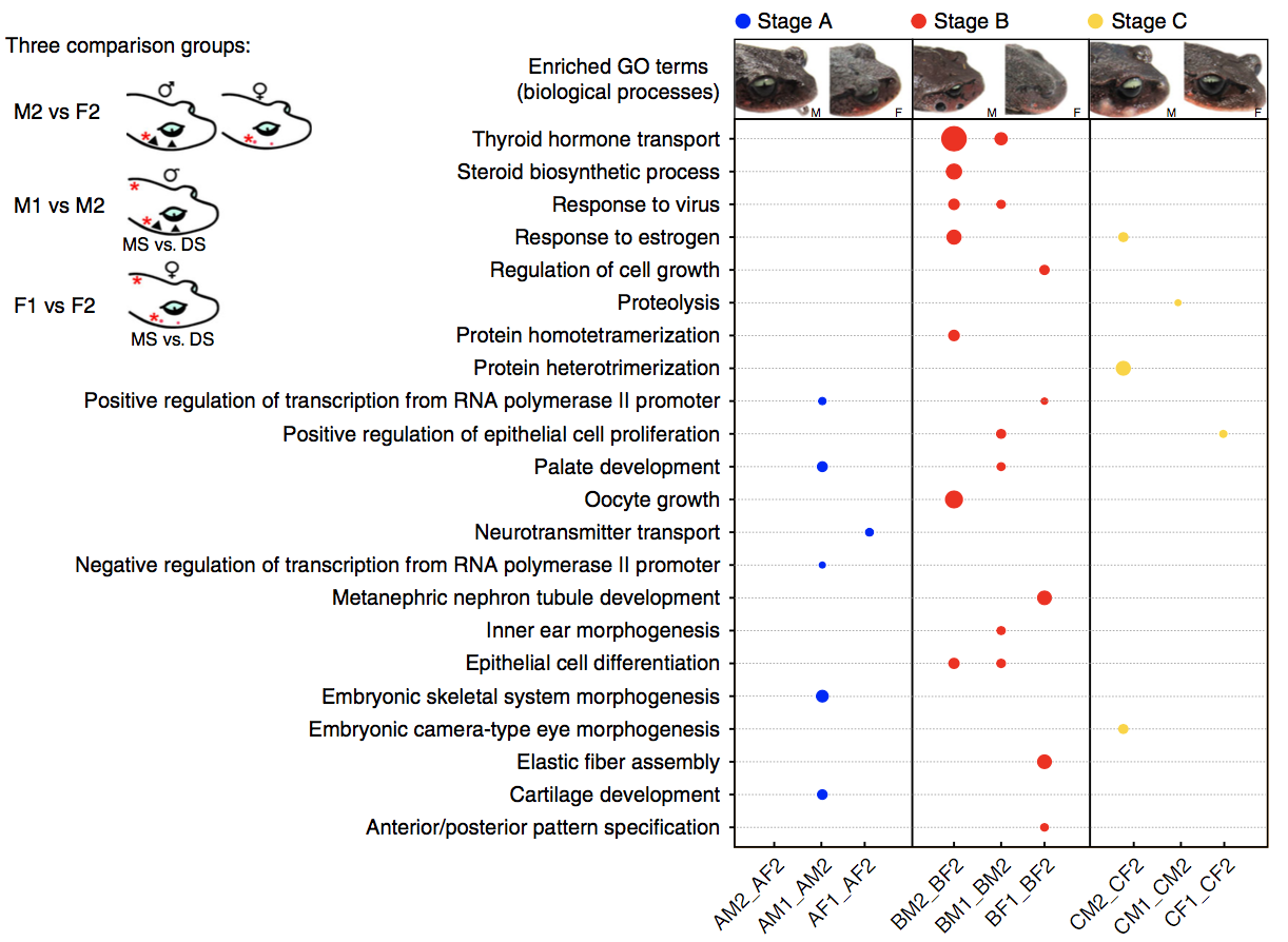 在雌雄異體的有性生物中,兩性之間在體型大小、形態(tài)結構和功能等方面存在明顯差異的現(xiàn)象稱為性二態(tài)(Sexual dimorphism)。自然界普遍存在的性二態(tài)(如劍尾魚的劍狀尾和獅子的鬃毛等)一直是進化生物學家關注的熱點問題。兩棲動物具有豐富的性二態(tài)特征,繁殖期的雄性雷山髭蟾在上頜的皮膚形成角質(zhì)刺,類似于人類的“胡子”,因此又被稱為“胡子蟾”,繁殖期過后,角質(zhì)刺外殼會脫落,而雌性則沒有這種特征。由于除了性染色體上的基因外,大多數(shù)的基因組在雄性和雌性之間是共享的,所以性二態(tài)往往是由基因在性別間差異性表達引起的。由于缺乏參考基因組,很少有研究能夠?qū)⑿詣e差異表達模式與特定的性二態(tài)特征聯(lián)系起來,與性二態(tài)性狀相關的重要生物學過程和關鍵基因也一直難以破解。本文成功的建立了一個具有代表性的鋤足蟾亞目基因組,并對其皮膚來源的性二態(tài)性狀進行了分子基礎的研究。