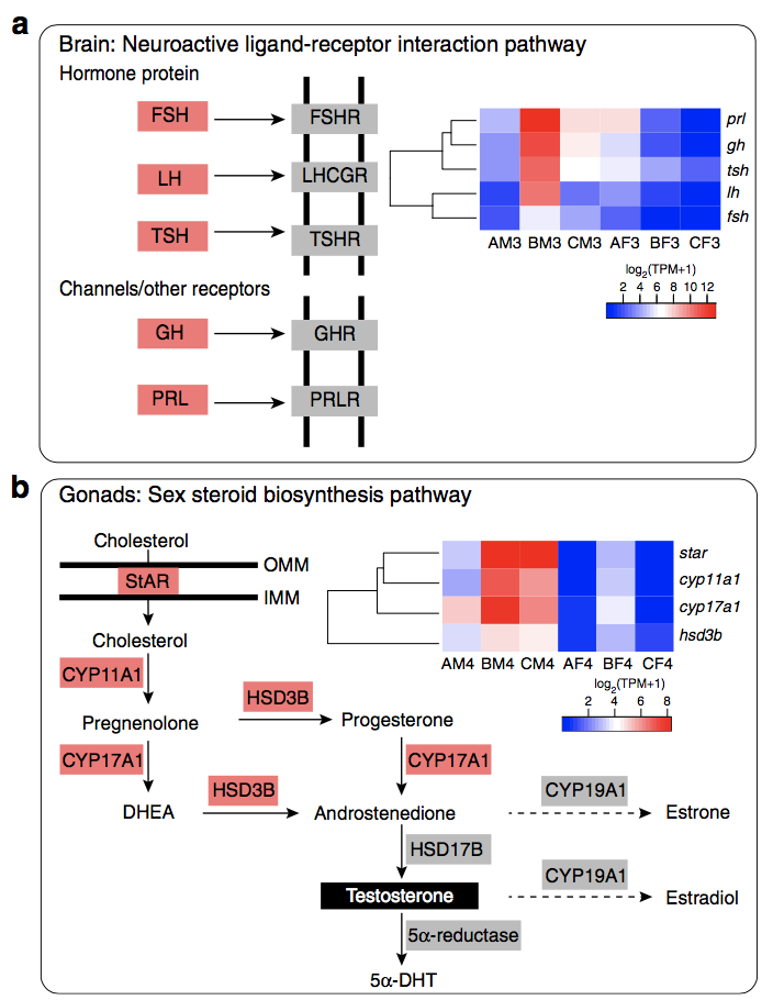 為了探討L.?leishanense中角質(zhì)刺的激素調(diào)節(jié),研究者對來自大腦和性腺的轉(zhuǎn)錄組數(shù)據(jù)進行了測序(表2)。研究發(fā)現(xiàn)B期雄性和雌性之間的DEGs(BM3-BF3)和A期和B期雄性之間的DEGs(AM3-BM3)中的神經(jīng)活性配體-受體相互作用途徑顯著富集,在這些基因中,LH(黃體生成素)和FSH(卵泡刺激素)編碼肽激素,通過血液進入性腺刺激類固醇激素的合成(圖9)。相關基因的表達表明雄性在繁殖季節(jié)中下丘腦-垂體-性腺軸的激活。雄性精巢在不同時期的類固醇激素生物合成途徑顯著豐富。在這條途徑中,編碼參與性類固醇生物合成的酶的基因在B期雄性精巢中高度表達(圖9),表明B期雄性精巢中雄激素(睪酮和5α-DHT)生物合成水平較高。