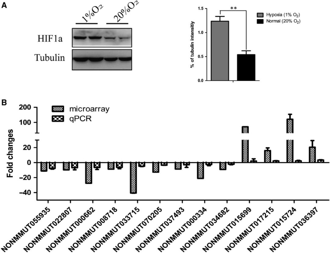 缺氧是實體腫瘤的一個顯著特征,低氧腫瘤通常對傳統的癌癥治療有抵抗力,且腫瘤低氧與晚期惡性腫瘤和轉移相關。作者進一步研究了低氧調節的潛在的lncRNAs。將KP細胞在常氧(20% O2)和缺氧(1% O2)中培養48h,WB結果顯示缺氧可有效上調KP細胞HIF1α的表達(圖A)。RT-PCR結果顯示,缺氧誘導的KP細胞中有13個lncRNAs表達下調,4個lncRNAs在缺氧誘導下表達上調,其表達變化方向與小鼠肺腺癌組織芯片中的表達變化方向一致(圖B)。