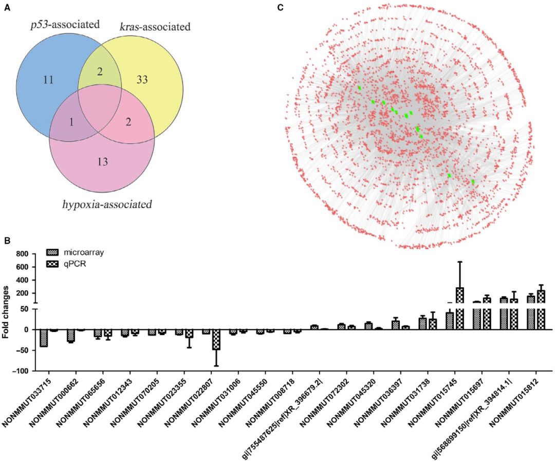 芯片篩選出的210個LncRNAs中,有52個LncRNAs的表達變化與p53、Kras或缺氧有關。其中,2個受p53調控的lncRNAs也受Kras調控,2個受KRAS調控的lncRNAs和1個受p53調控的lncRNA在缺氧條件下也可以被調控(圖A)。選擇19個FC>3.5的lncRNAs,采用定量RT-PCR方法進一步驗證其在6例肺腺癌組織和6例正常肺組織中的表達。定量RT-PCR結果顯示,19個lncRNAs的表達與微陣列結果一致(圖B)。構建與上述19個lncRNAs相關的lncRNA-lncRNA共表達網絡(LLCN)。網絡圖顯示,在19個lncRNAs中,有6個lncRNAs與其他lncRNAs無顯著共表達,有13個lncRNAs與其他lncRNAs顯著共表達(圖C)。