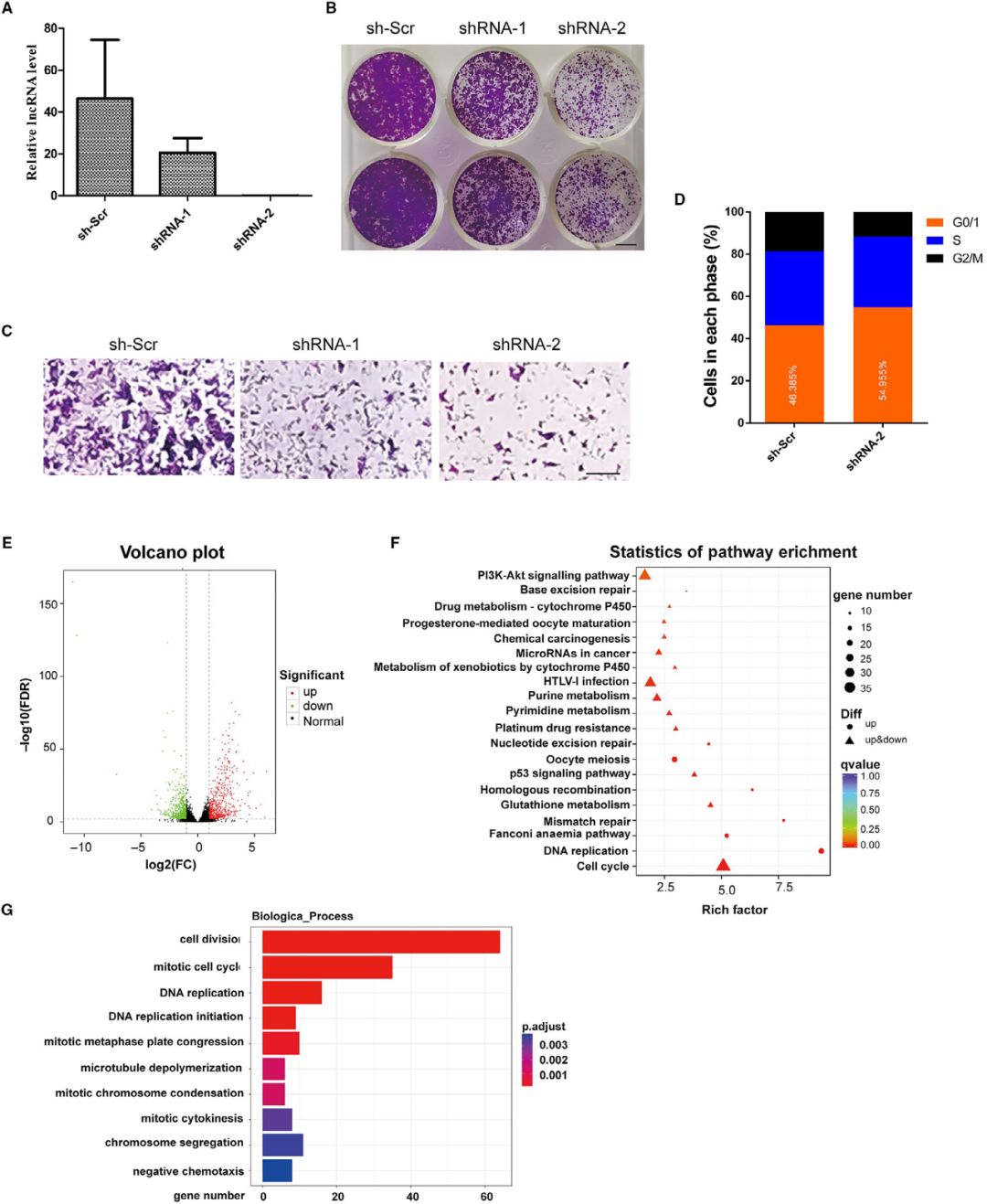 通過設計慢病毒介導的shRNAs來下調NONMMUT015812的表達,qPCR結果顯示其可使KP細胞中NONMMUT015812的表達減少80%以上(圖A)。克隆形成實驗顯示,NONMMUT015812基因的敲除顯著抑制了KP細胞的生長(圖B)。此外,在Transwell實驗中,穩定的NONMMUT015812基因敲除的KP細胞與對照細胞相比遷移明顯減少(圖C)。流式細胞術分析表明,NONMMUT015812基因敲除導致KP細胞明顯阻滯于G0/G1期,G2/M期細胞數量減少(圖D)。而NONMMUT015812基因敲除對細胞凋亡無明顯影響。