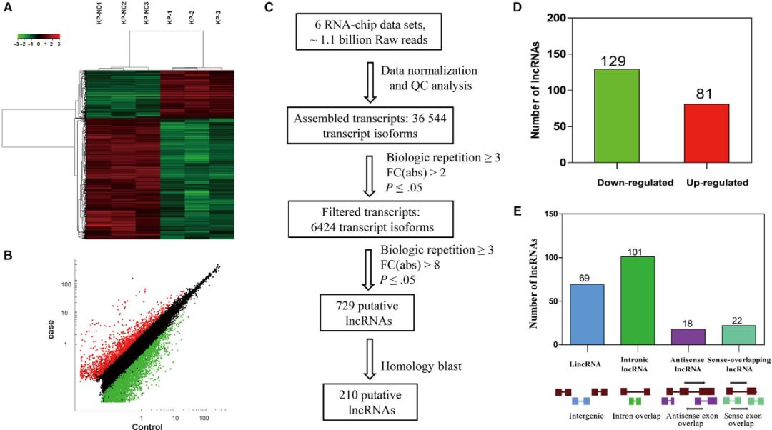 使用芯片技術檢測lncRNA,差異表達lncRNAs的散點圖和聚類圖顯示了肺腺癌和正常肺樣本之間有明顯區別(圖A、B)。重點研究了在人和鼠之間具有較高差異倍數且保守的lncRNAs,當FC>8,P<0.05時,鑒定到729個lncRNA。根據染色體位置保守性和序列保守性,篩選出210個具有潛在人類同源物的lncRNA用于后續驗證,其中129個上調,81個下調(圖C、D)。根據其基因組位置,將210個lncRNA分為u(基因間)、i(內含子)、x(反義)和o(正義重疊)四大類。已鑒定的lncRNAs大部分屬于i類,有101個(48.09%)(圖E)。