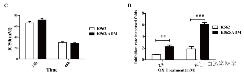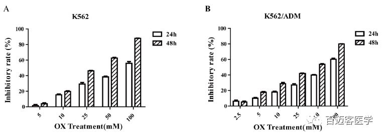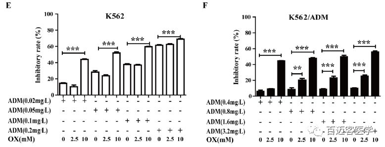 如圖,單獨用草酸處理的兩個細胞系均呈現時間和劑量依賴性細胞毒性,但是細胞毒性相對較低。相比于單獨用ADM處理,用ADM和草酸聯合處理后,K562細胞和K562/ADM細胞增殖抑制率分別提高了為2.28±0.56倍和6.08±0.77倍,K562/ADM細胞增殖抑制率的增加倍數明顯高于K562細胞。