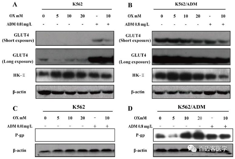 在上述試驗中,作者發現ADM聯合草酸處理增加了人白血病細胞的細胞毒性。然后,作者研究了草酸對ADM處理的K562和K562/ADM細胞系糖代謝作用的影響,發現相比于ADM單獨處理,ADM和草酸共同處理48h后,兩個細胞系的葡萄糖消耗和乳酸生成的抑制作用均有所增強。草酸導致兩種細胞系糖酵解抑制呈現劑量依賴性增加,而耐藥細胞糖酵解抑制的變化倍數更高,這與聯合處理時耐藥細胞療效升高倍數更高所一致,說明草酸對糖酵解的抑制導致葡萄糖消耗和乳酸生成的減少,導致白血病細胞對ADM的敏感性增加。