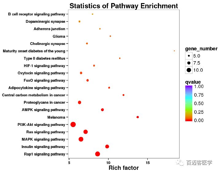 此外,KEGG聚類和富集分析顯示,與K562細胞相比,K562/ADM細胞中存在多個生物學過程的變化。為了進一步闡明糖代謝重編程的分子機制,將DEG比對到參與葡萄糖代謝的相關信號轉導途徑。所有DEG都是比對到了信號轉導途徑,如MAPK、PI3K-AKT、HIF、Ras等。如圖,PI3K-AKT通路是DEG富集最多的通路。PI3K-AKT通路通過調節代謝分子(包括LDHA、HK-II和GLUT)的表達或移位,作為代謝穩態的關鍵調控因子。結果顯示,PI3K-AKT通路是K562/ADM細胞中最富集的上調通路,與糖代謝重編程和MDR的發展有關。